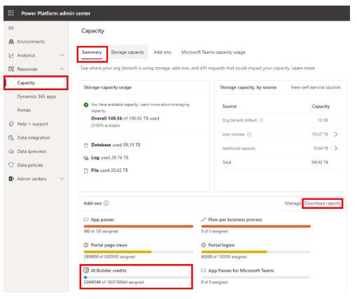 הקצאת הקרדיטים מתבצעת ברמת Environment – המקום הראשון לעקוב ממנו אחרי צריכת הקרדיטים הכללית הוא מתוך Power Platfrom Admin –
