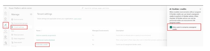 ומה קורה אם נחרוג מכמות הקרדיטים , או איך ניתן למנוע צריכה לא מבוקרת של קרדיטים – גם זה ניתן לביצוע באמצעות הגדרות הטננט ב-Power Platfrom Admin בנתיב הבא