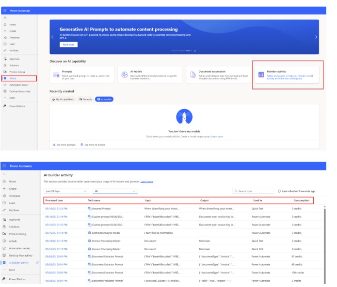 - בצד שמאל לחץ על More → Monitor → AI Builder Activity